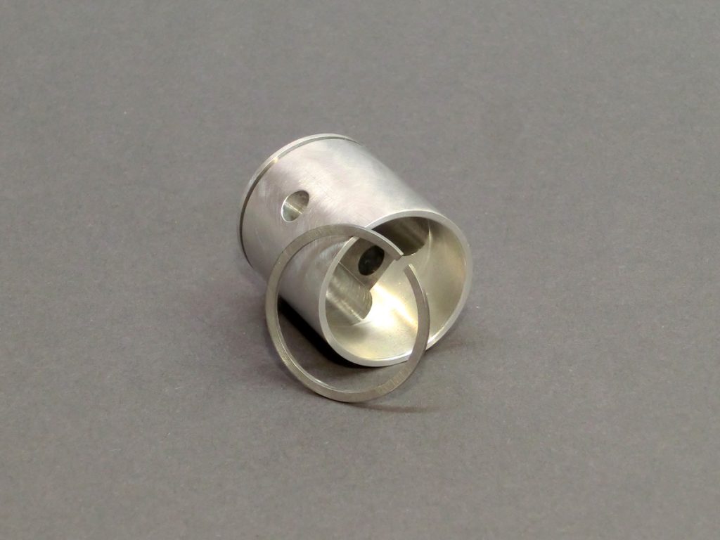 Begonnen habe ich den Bau des Motors mit der Herstellung der Laufbuchse, die aus Grauguss GG-25 besteht und innen eine gehonte Lauffläche für den Kolben aufweist. Dieses Bauteil ist schon etwas kompliziert, da es neben den beidseitigen Flanschen zur Aufnahme und Abdichtung des Kühlwassermantels aus Aluminium auch eine eben gefräste Fläche mit einem durchgehenden M10x1 Gewinde bekam.