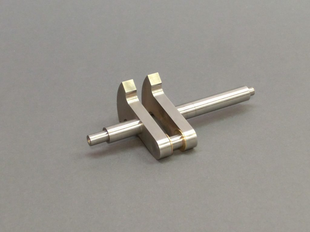 Die Kurbelwelle besteht aus 5 Einzelteilen. Der Kurbelzapfen und die beiden Hauptlagerzapfen habe ich mit einer sehr geringen Presspassung und Loctite 648 in die Kurbelwangen gefügt. Die beiden Hauptlagerzapfen hatten im Durchmesser nach dem Zusammenfügen noch ca. 0,5mm Aufmass. Um sie auf genauen Durchmesser zu drehen, befestigte ich gegenüber dem Kurbelzapfen zwischen den Kurbelwangen einen genau auf Länge gefertigten Bolzen, der ohne Spiel zwischen die Kurbelwangen passte und durch reichlich Klebeband gegen ein Herausfliegen während der nachfolgenden Bearbeitung gesichert wurde.