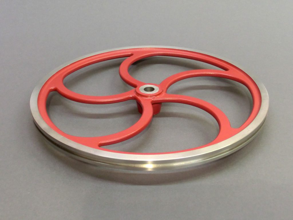 Ein weiteres Bauteil, welches ich in meinem Bericht nicht unerwähnt lassen möchte, ist das große Schwungrad. Es hat einen Durchmesser von 262mm und wurde aus einer massiven Scheibe Stahl C-45 herausgearbeitet. Obwohl ich die Herstellung auf einer kleinen Industrie-Drehmaschine vornehmen konnte (Spitzenweite 650mm, Spitzenhöhe 160mm), gestaltete sich das Zerspanen oft als schwierig und meine Drehmaschine kam an ihre Grenzen.